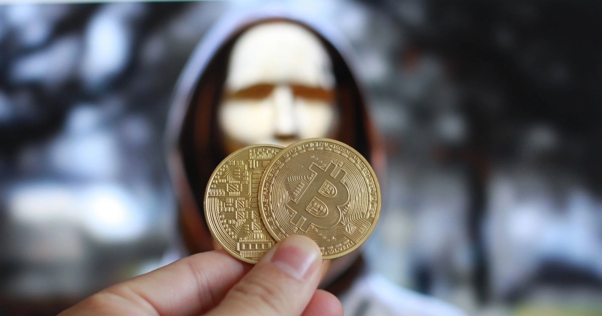 Đồng xu biểu tượng Bitcoin trước tượng Satoshi Nakamoto
