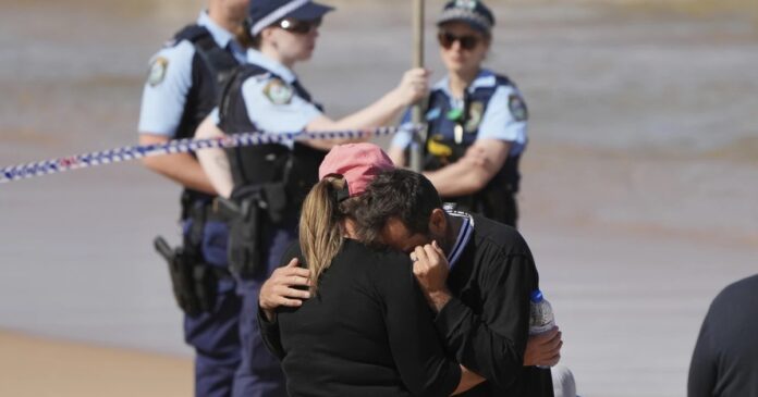 Người đàn ông đang được trấn an tại hiện trường vụ cá mập tấn công chết người ở bãi biển Sydney, Úc ngày 6.9