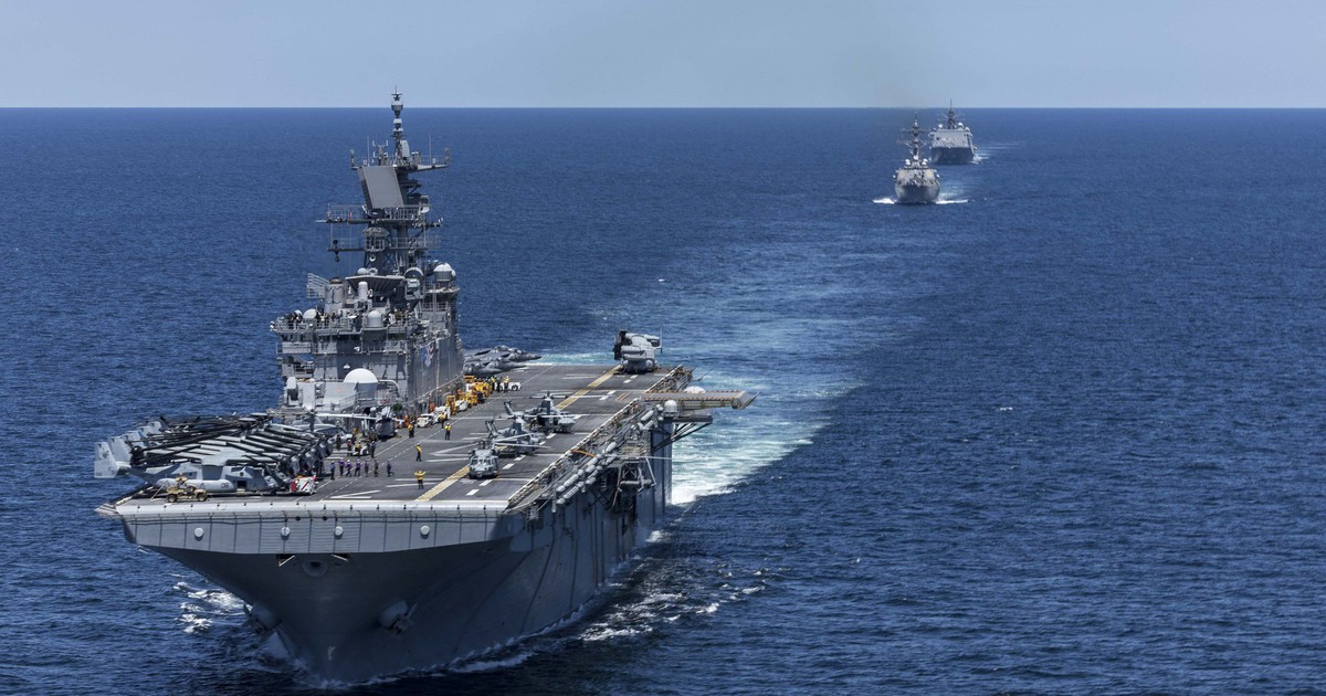 Tàu đổ bộ tấn công lớp Wasp USS Iwo Jima (LHD 7), tàu khu trục USS Gonzalez (DDG 66), và tàu vận tải đổ bộ lớp San Antonio USS Fort Lauderdale (LPD 28) của Mỹ di chuyển theo đội hình ngày 22.5