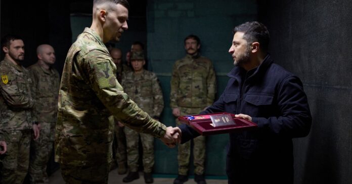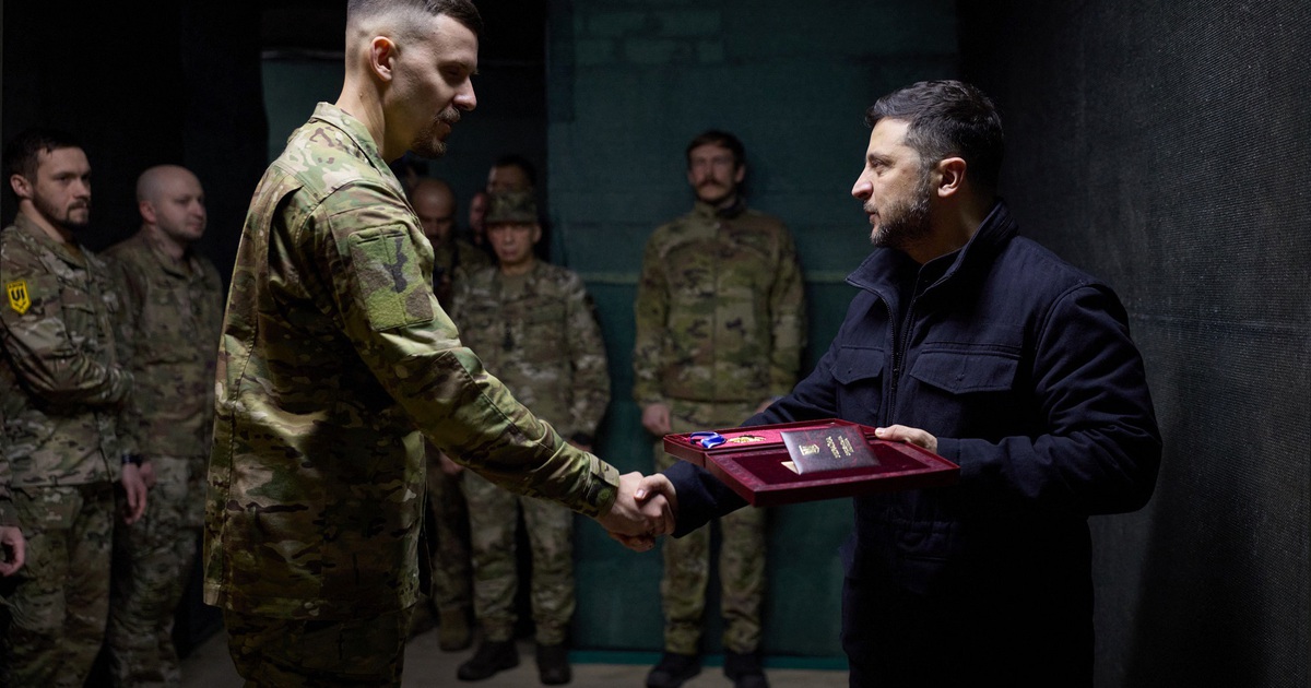 Tổng thống Ukraine Volodymyr Zelensky (phải) trao tặng phần thưởng cho quân nhân khi thăm tiền tuyến ở tỉnh Donetsk ngày 4.11