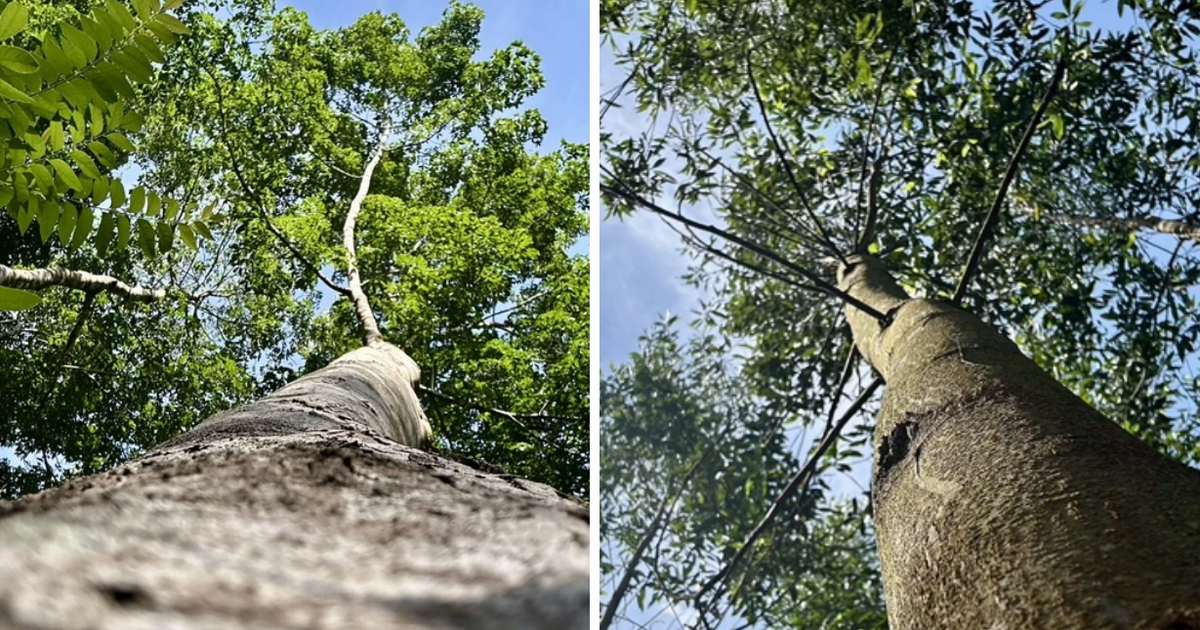 (trái) Cây không áp dụng biện pháp tỉa cành và thân phụ, (phải) cây được áp dụng kỹ thuật này ở lô rừng của công ty Lâm nghiệp Quy Nhơn, tỉnh Gia Lai