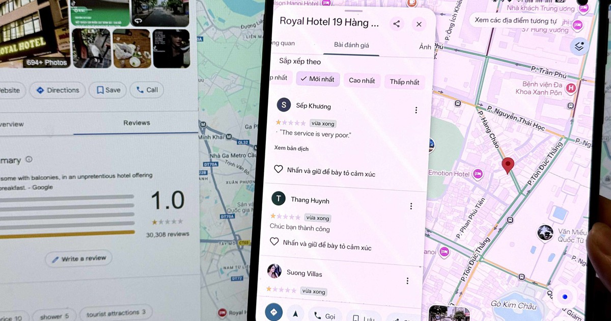 Trên Google Maps, khi tìm kiếm những khách sạn tại Hà Nội có chữ “Royal” trong tên không dễ để nhận ra có rất nhiều đánh giá tiêu cực “đi lạc” trong khoảng 2 ngày gần đây, gây khó khăn và bức xúc cho chủ kinh doanh của các đơn vị.