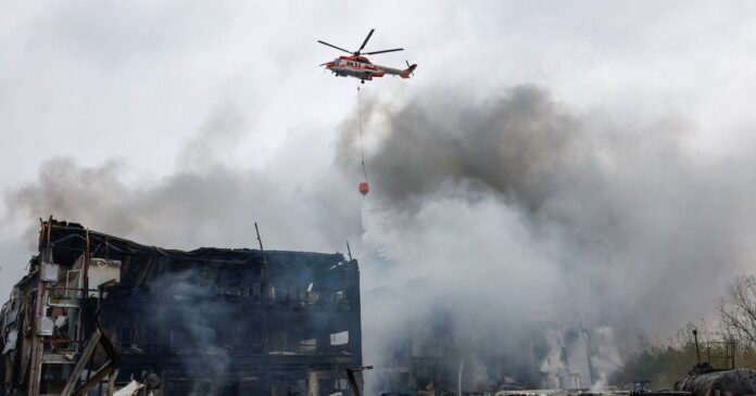 Trực thăng chữa cháy tại kho thực phẩm ở Kyiv (Ukraine), nơi bị trúng tên lửa ngày 25.10