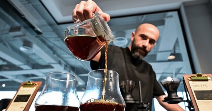 Ông Serkan Sagsoz đang pha chế cà phê Nido 7FC Panama có giá 3.600 AED tại quán cà phê của ông ở Dubai ngày 30.10