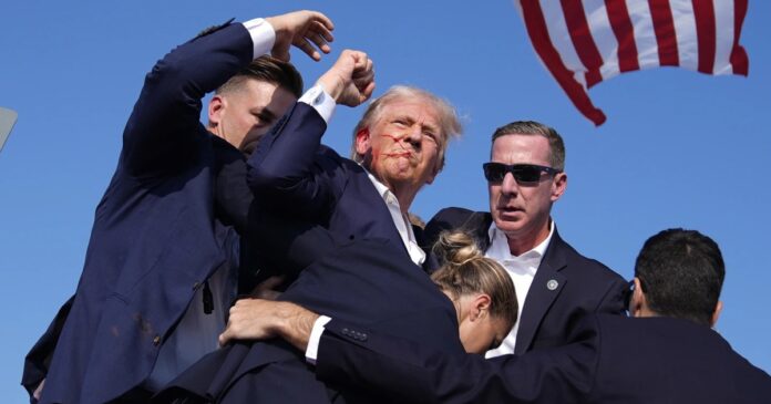 Mật vụ Mỹ bảo vệ Tổng thống Mỹ Donald Trump sau khi ông Trump bị bắn sượt qua tai giữa lúc vận động tại bang Pennsylvania ngày 13.7.2024