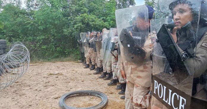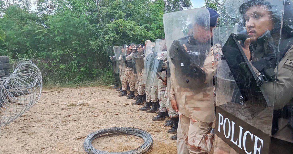 Cảnh sát Thái Lan cầm khiên đứng cạnh hàng rào thép gai tại khu vực tranh chấp dọc biên giới Campuchia – Thái Lan ở tỉnh Sa Kaeo ngày 17.9.2025