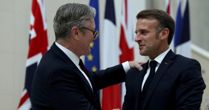 Thủ tướng Anh Keir Starmer (trái) bắt tay Tổng thống Pháp Emmanuel Macron tại London ngày 9.7